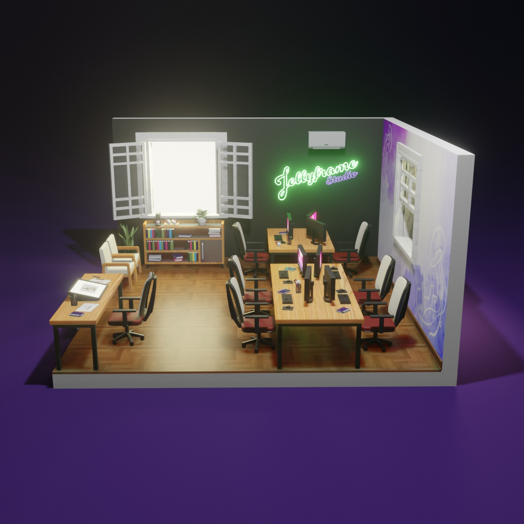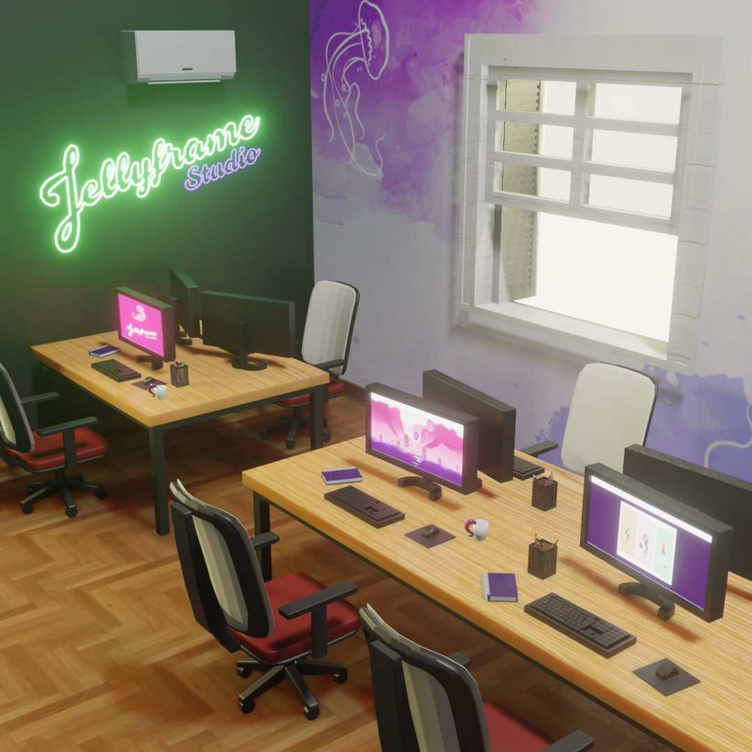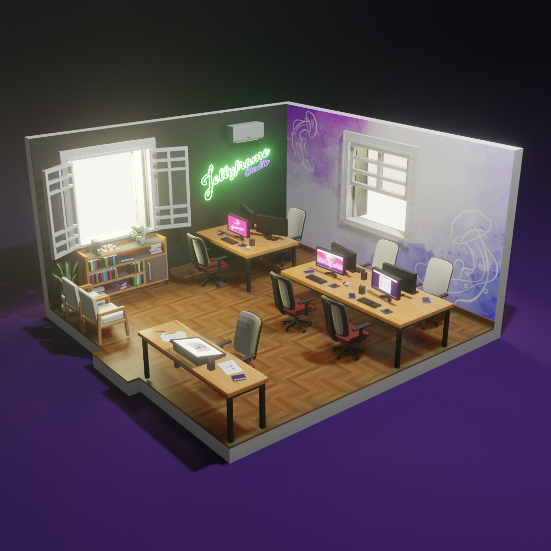 3D project showing a room from Jellyframe Studio, an Animation Studio based in São Paulo - Brazil.