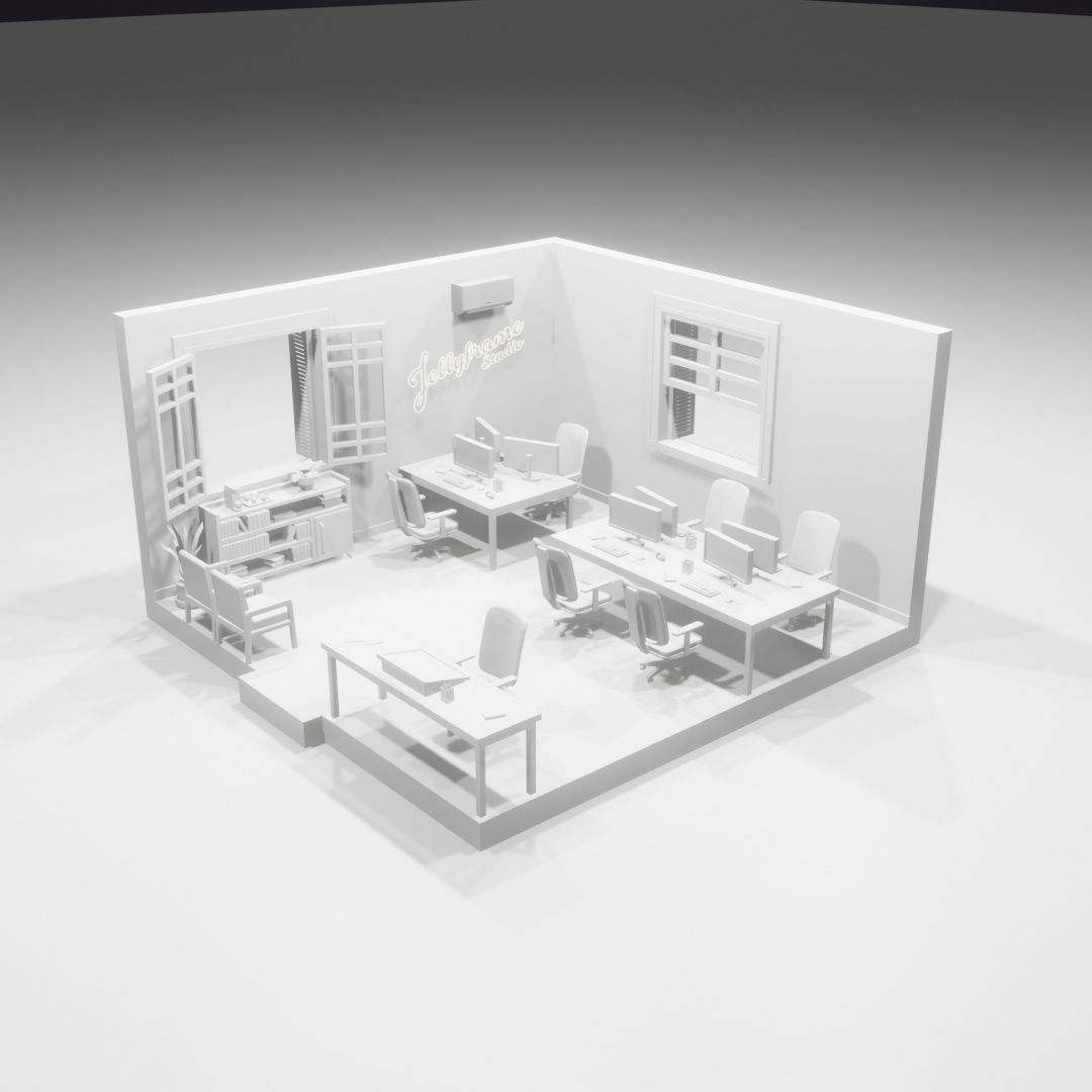 Projeto em 3D mostrando como seria o escritório da Jellyframe Studio, um estúdio de Animação localizado em São Paulo.